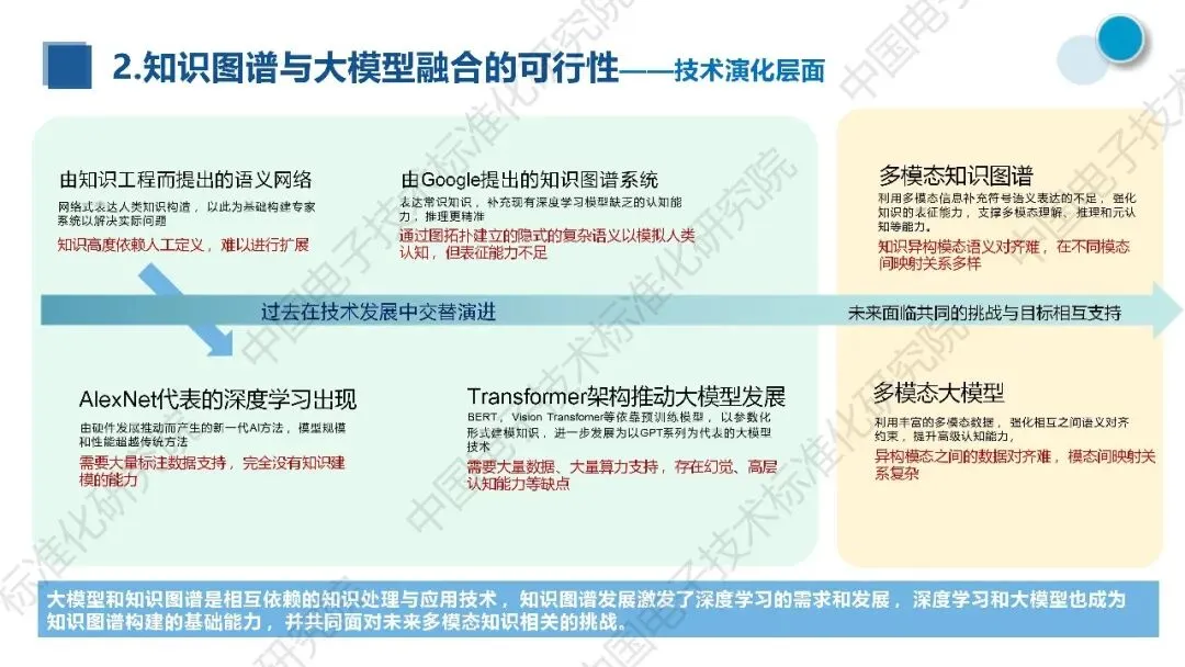 知识图谱与大模型在技术发展上交替演进,相互支持。知识图谱的发展激发了深度学习的需求,而深度学习和大模型也成为知识图谱构建的基础能力。未来,两者将共同面对多模态知识处理的挑战,通过相互增强实现技术进步。