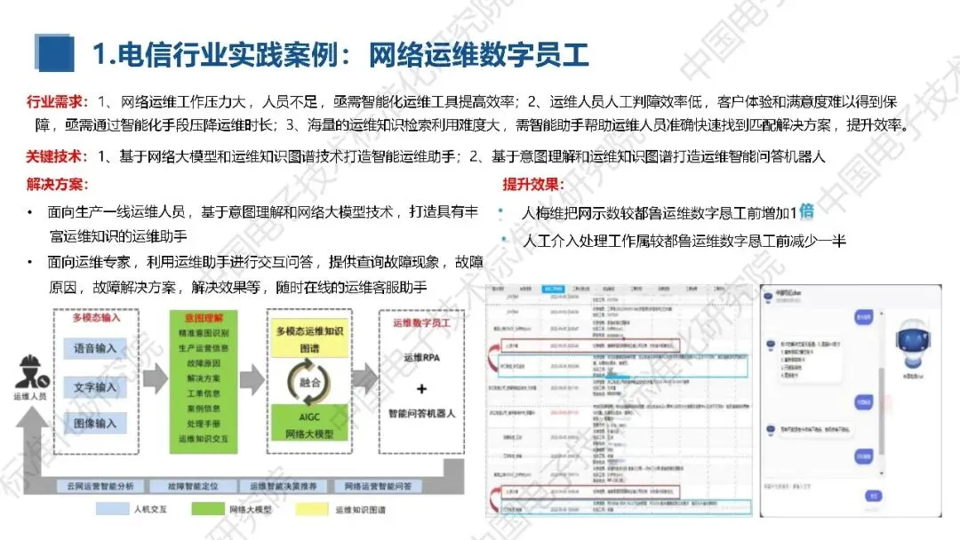 在电信行业,基于网络大模型和运维知识图谱技术打造的智能运维助手,能够显著提高运维效率,降低人工判障时间。通过意图理解和运维知识图谱,智能运维助手能够为运维人员提供准确的故障现象、原因和解决方案,提升客户体验和满意度。