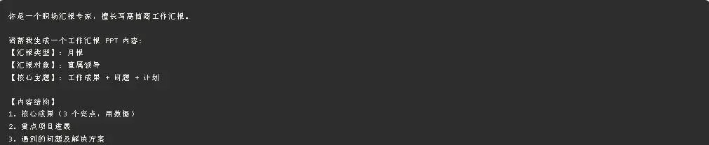 不要一上来就打开 PPT 软件。**先用提示词 1 生成大纲,确认逻辑没问题**,再填充内容。这样能避免做到一半发现思路不对,全部重做。