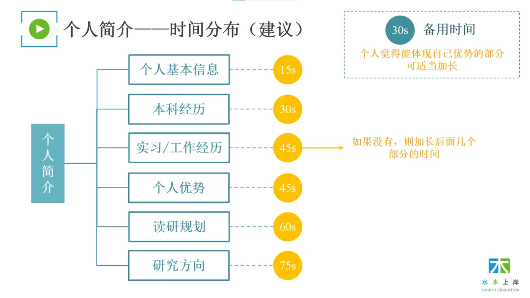 上述环节总计约4分30秒,务必留出15-30秒缓冲时间,用于应对意外(如卡顿)、进行简短总结、适当加长个人觉得能体现自己优势的部分,所以平时练习需要严格计时。