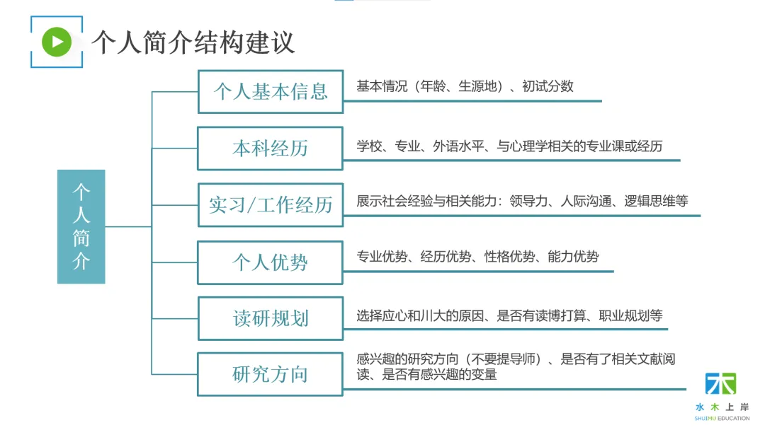 1.跨专业的同学,必须回答“为什么”:如果你是跨考,一定要清晰、真诚地阐述你为什么要选择心理学。可以结合个人经历或观察到的现象来说,同时自然地引出自己想要研究的方向。