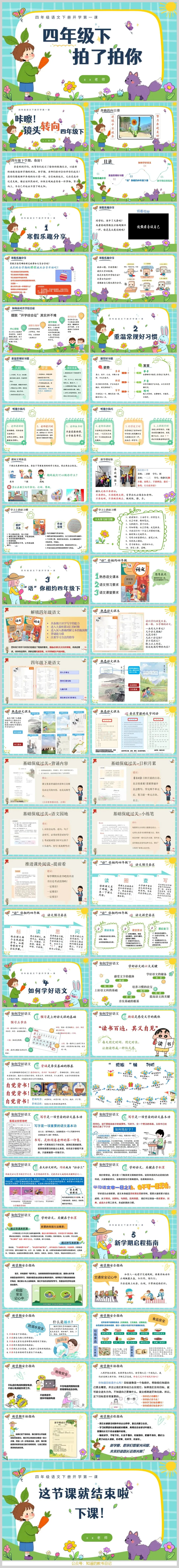 各位老师好!新学期伊始,这里向您推荐一份四年级下册语文开学第一课PPT课件。它以生动有趣的形式,帮助学生快速从假期模式切换至学习状态,并为整个学期的语文学习打下坚实基础。📖✨