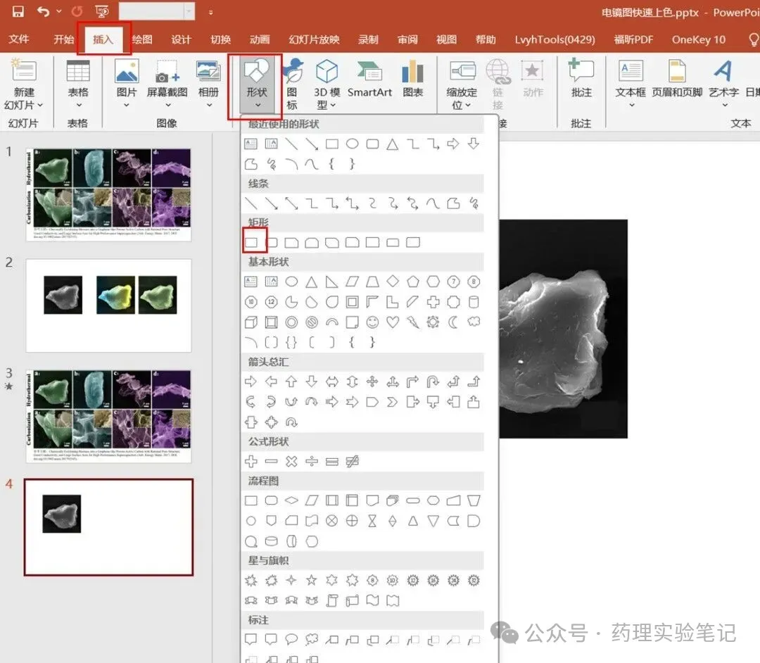 打开PPT并新建空白幻灯片,导入需要处理的电镜图像。点击"插入"菜单,选择"形状",插入一个矩形图形。