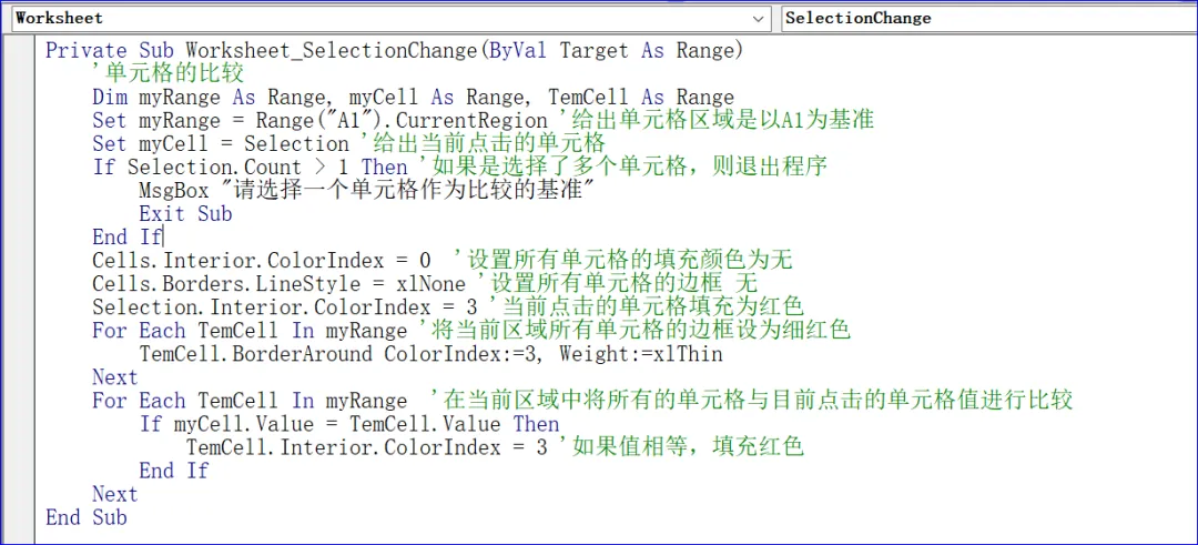 ForEach TemCell In myRange'在当前区域中将所有的单元格与目前点击的单元格值进行比较