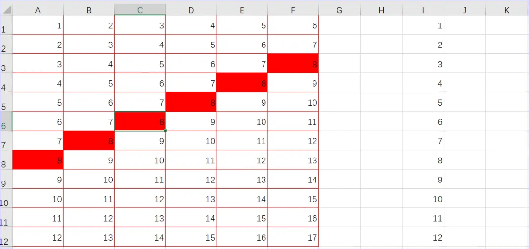 这时我们看到,在单元格区域中的所有相同数值的单元格都变成了红色。点击其他单元格时也会实现相同的效果。