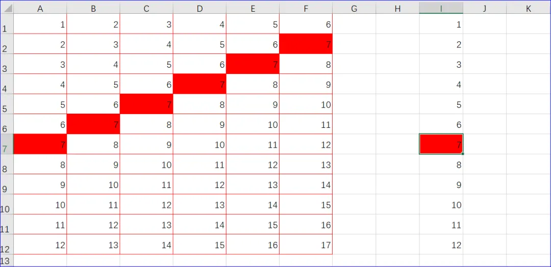 如上工作表,当我任意点击某个单元格时,可以把所有具有相同值的单元格都显示为红色。同时,在工作表的I列给出了一系列的值,当点击其中任意值时,也可以实现相同的效果。