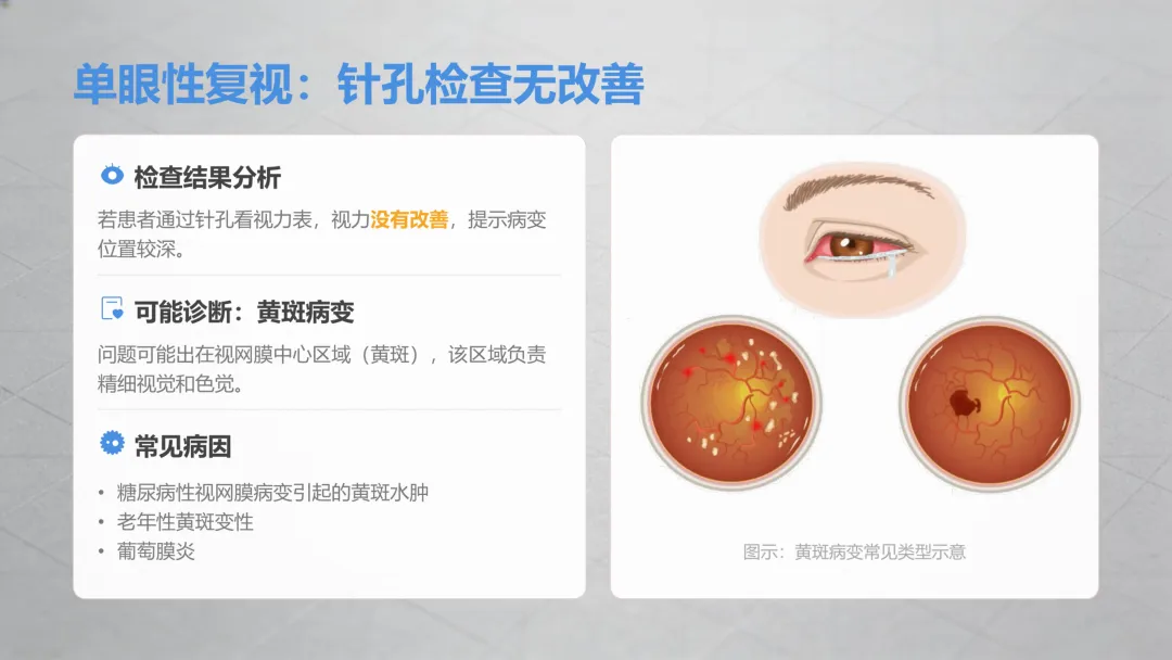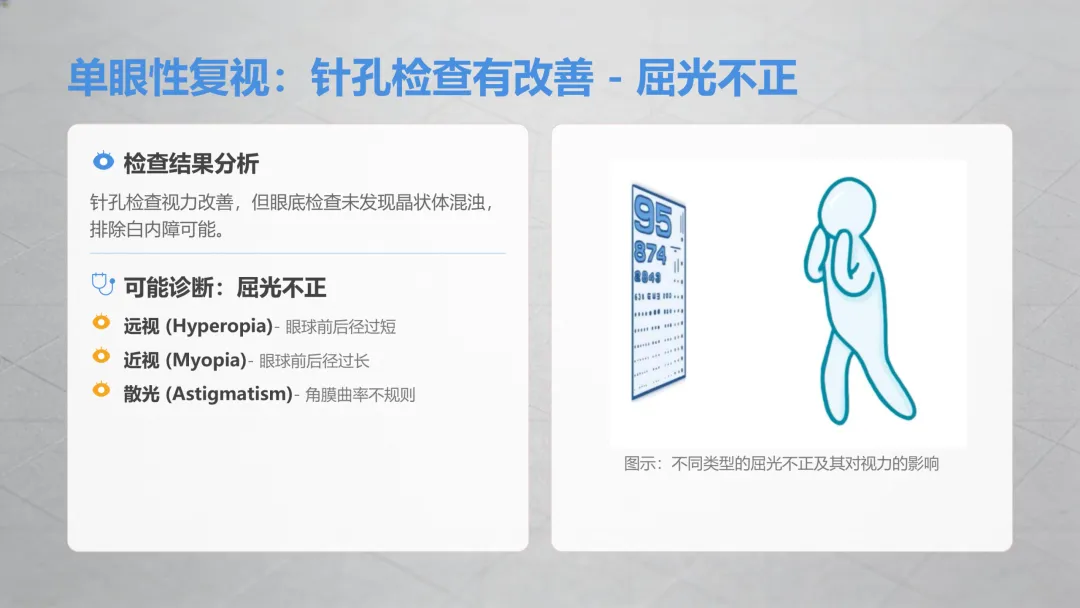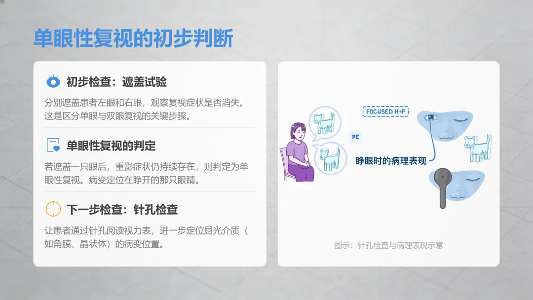 这种重影只和单只眼睛相关,和双眼协调无关,做完遮盖试验确定后,再做一个针孔自查(找一张纸扎个小孔,透过小孔看视力表、手机文字都可以),就能初步锁定原因,超简单!