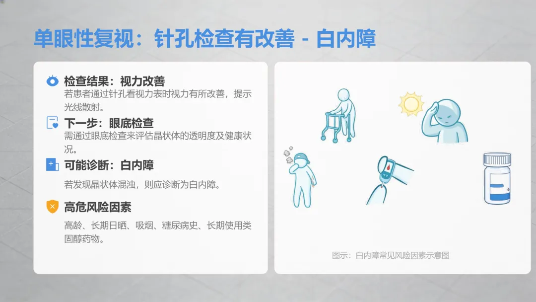 这是单眼复视中最常见的情况,大概率是白内障!晶状体变浑浊后,光线进入眼睛会发生散射,就会出现看东西重影、模糊的情况,高龄、长期日晒、吸烟、血糖异常、长期用激素类药物都是高危因素,不过不用慌,这种情况早发现早干预,后续改善效果都很好。