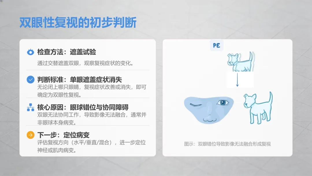 复视只是一个症状,不是单独的疾病,找到背后的原因才是关键,轻微的屈光不正、早期白内障都能轻松解决,但如果是神经、全身疾病引发的复视,早发现早治疗才能避免延误,出现以下情况别硬扛,立刻去检查: