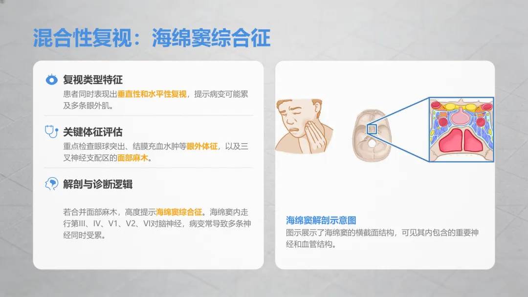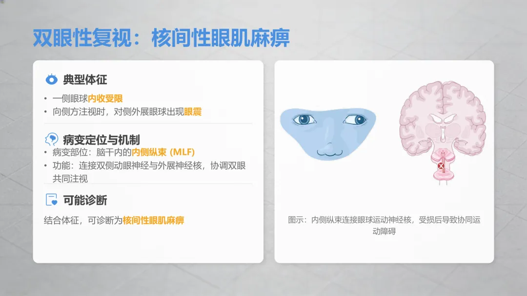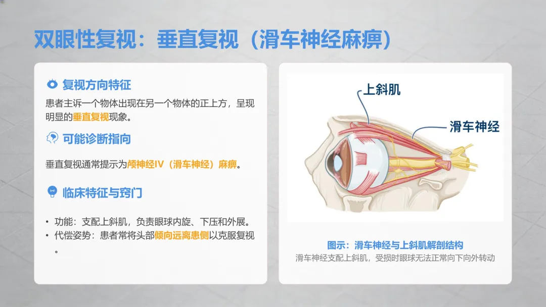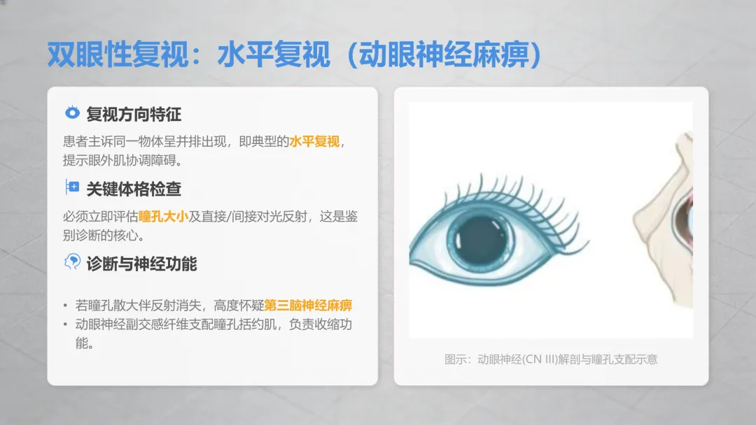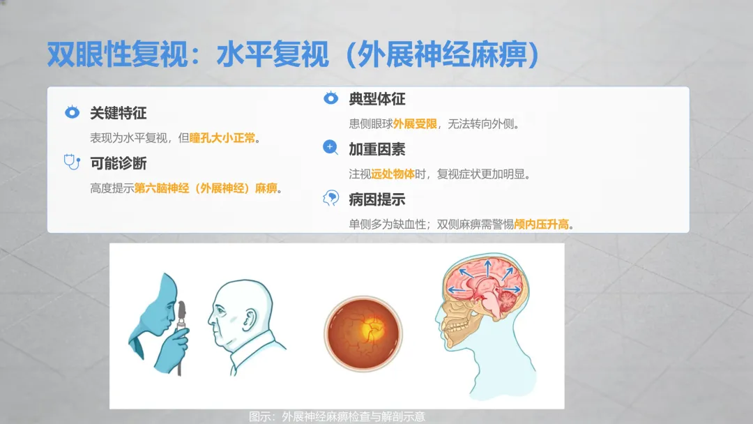 这是最常见的双眼复视类型,分两种关键情况,一定要区分清楚:✔️ 伴随眼皮抬不起来、眼球转动受限→多是眼部相关神经功能异常,糖尿病人、高血压患者是高危人群,日常要格外注意;✔️ 伴随眼球没法向外侧转动、看远处时重影更明显→同样是眼部神经问题,单侧出现多和眼部供血相关,双侧同时出现要警惕颅内压力异常,需及时检查。⚠️ 特别提醒:如果水平重影同时出现瞳孔变大、对光线没反应,一定要立刻就医,排除严重问题!