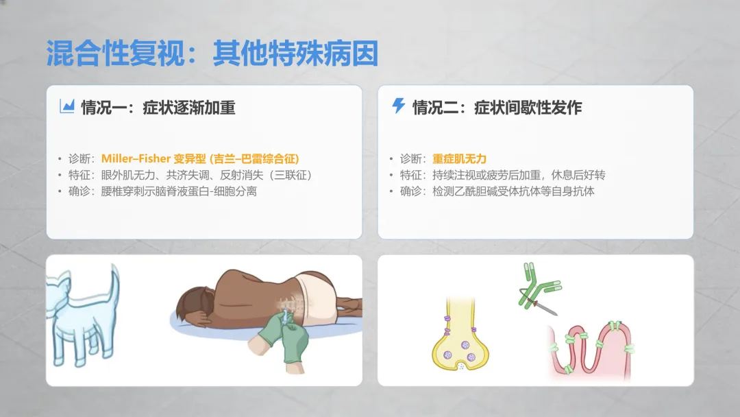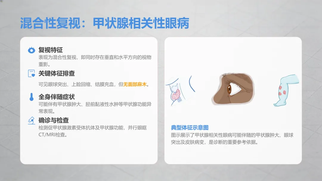 这种情况是多条眼部神经或肌肉同时受影响,相对复杂,结合伴随症状能快速初步判断:✔️ 伴随眼球突出、眼白发红 + 面部麻木→多是眼部周围组织病变影响了神经;✔️ 伴随眼球突出、眼皮回缩 + 甲状腺异常(脖子粗、怕热多汗、体重骤变)→甲状腺相关的眼部问题;✔️ 重影慢慢加重,还伴随走路不稳、肢体无力→要排查神经系统问题;✔️ 重影时有时无,累了、长时间看东西后加重,休息后就好转→大概率是肌无力相关问题。