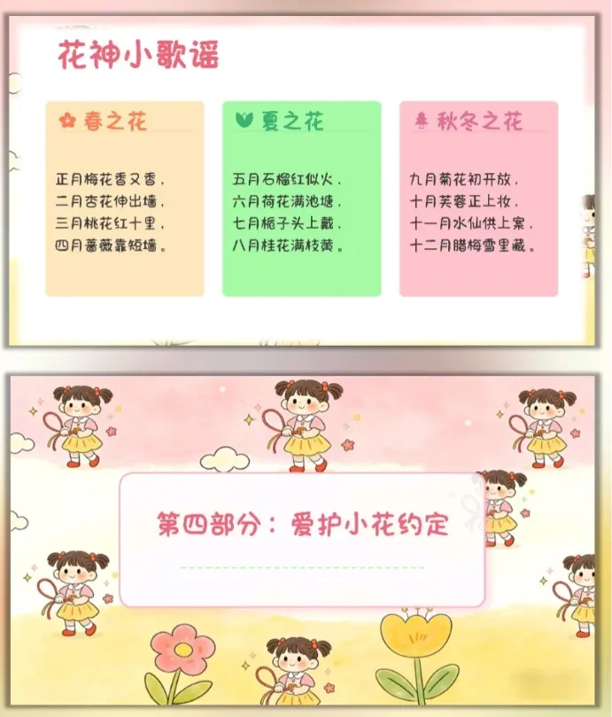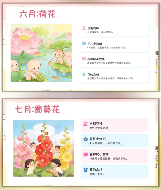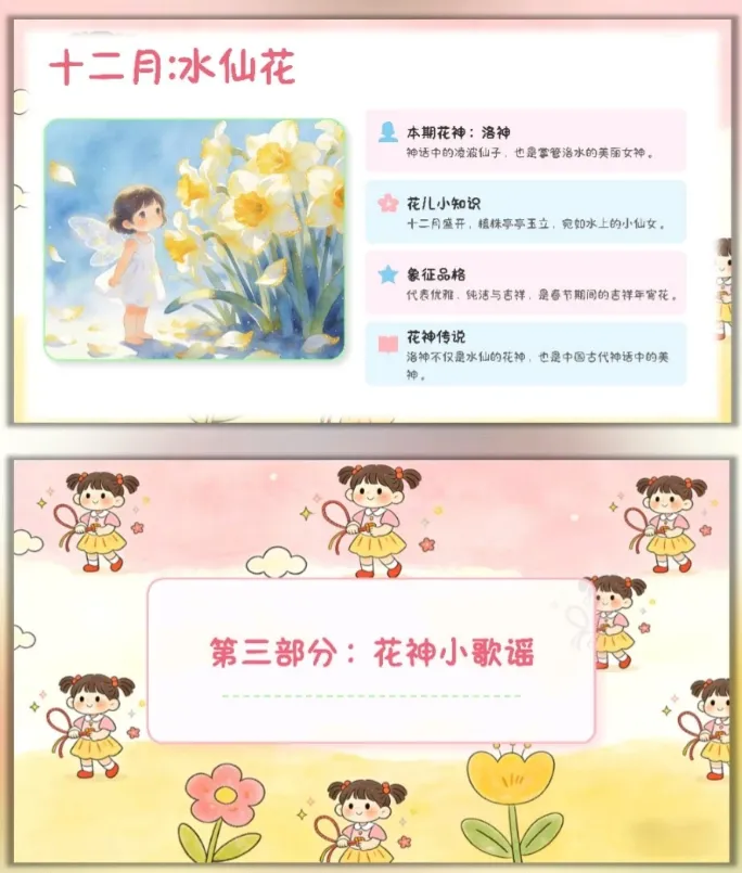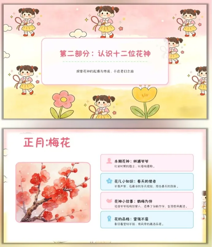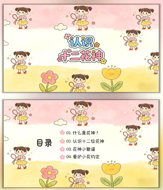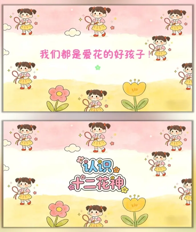本活动围绕“十二花神”展开,结合幼儿直观形象思维的特点,借助PPT中的花神传说、花卉知识、趣味歌谣等内容,让幼儿认识十二个月份对应的花卉及花神,感受不同花卉的特点与品格。通过故事、歌谣、互动问答等形式,激发幼儿对自然花卉的喜爱之情,培养幼儿爱护花草、尊重自然的美好品质,同时丰富幼儿的传统文化认知,感受传统花神文化的趣味与魅力。