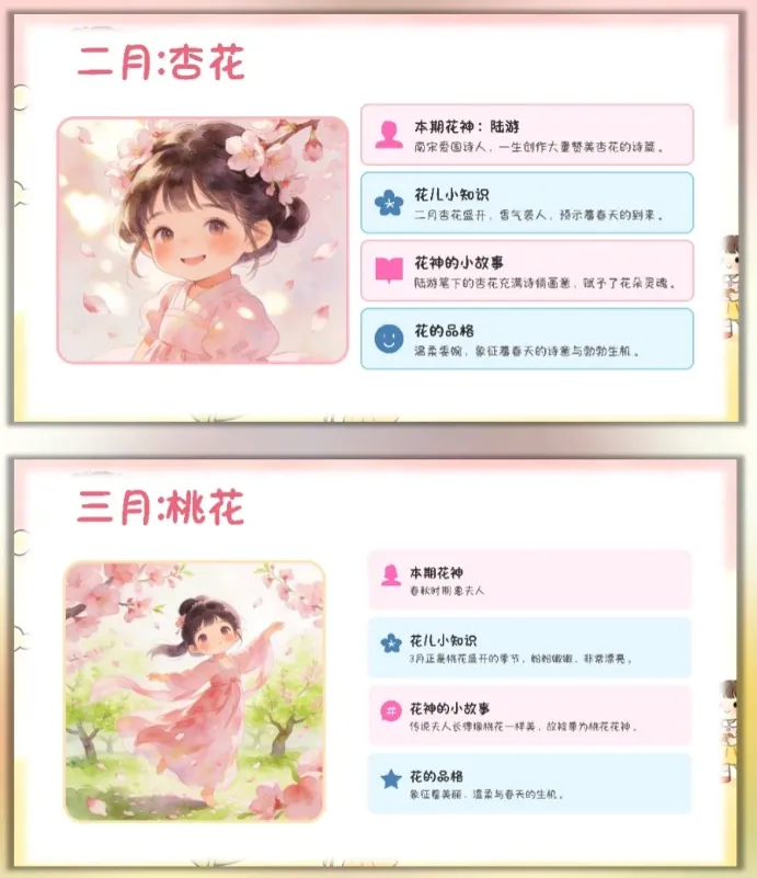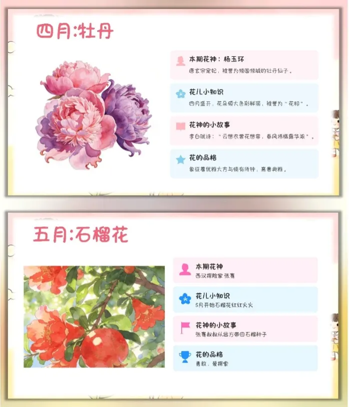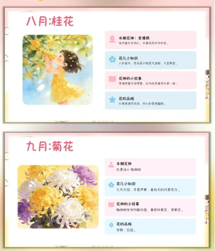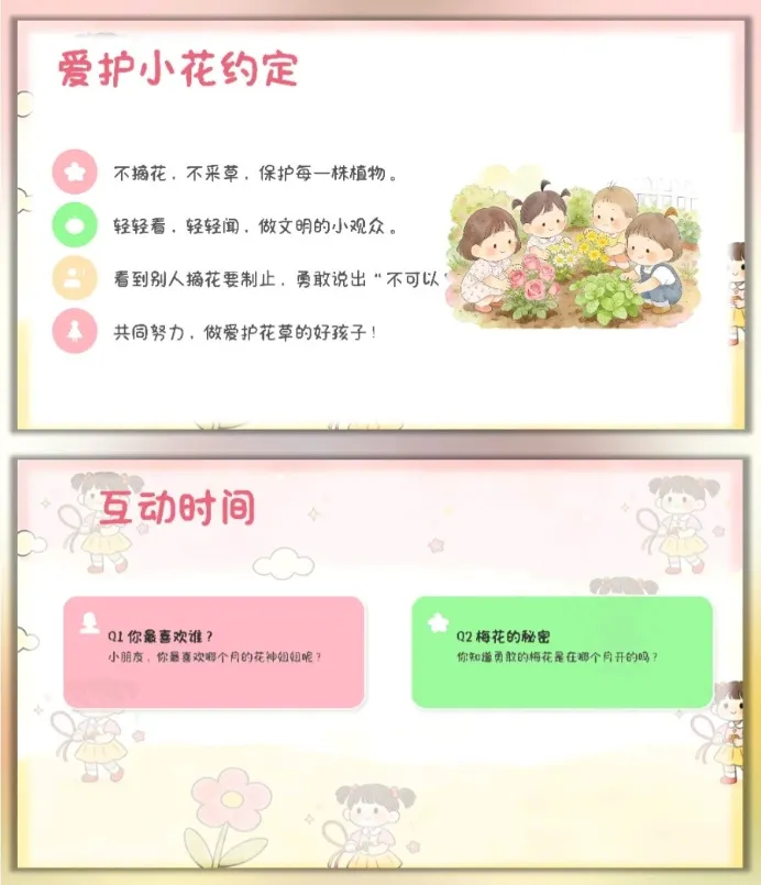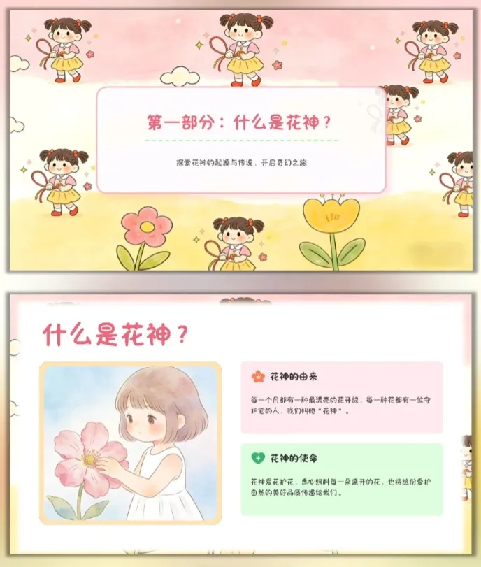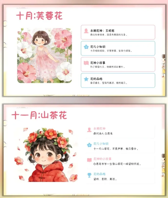 本活动围绕“十二花神”展开,结合幼儿直观形象思维的特点,借助PPT中的花神传说、花卉知识、趣味歌谣等内容,让幼儿认识十二个月份对应的花卉及花神,感受不同花卉的特点与品格。通过故事、歌谣、互动问答等形式,激发幼儿对自然花卉的喜爱之情,培养幼儿爱护花草、尊重自然的美好品质,同时丰富幼儿的传统文化认知,感受传统花神文化的趣味与魅力。