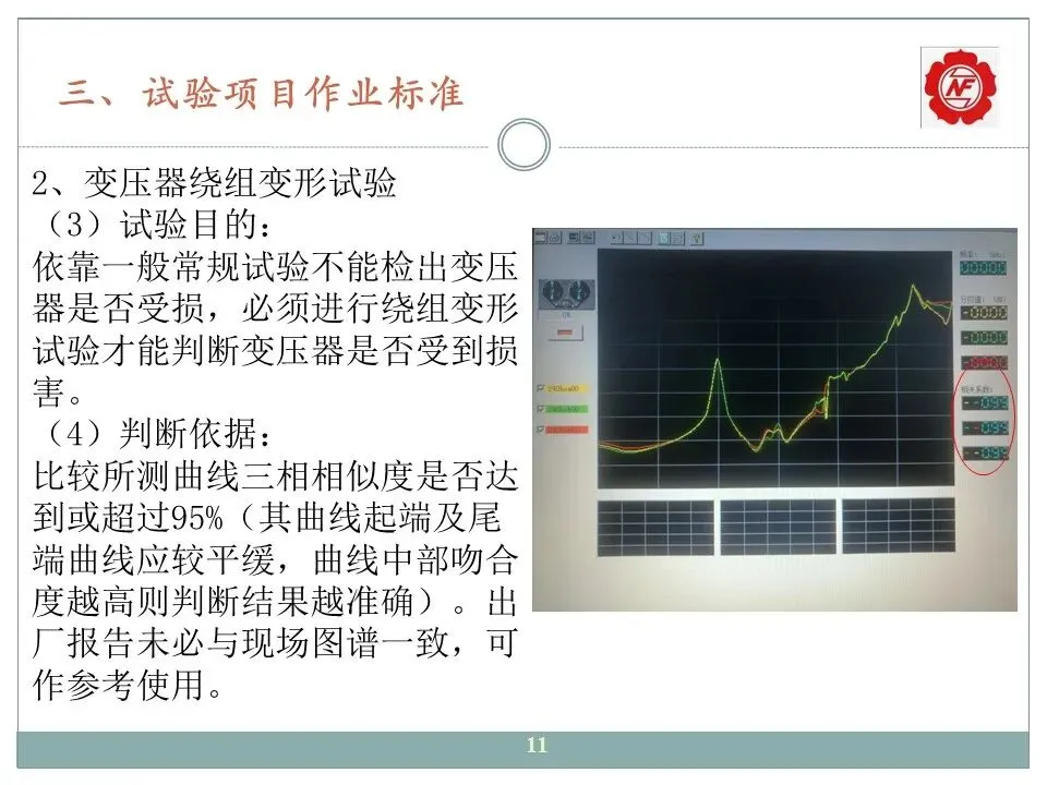 比较所测曲线三相相似度是否达到或超过95%(其曲线起端及尾端曲线应较平缓,曲线中部吻合度越高则判断结果越准确)。出厂报告未必与现场图谱一致,可作参考使用。
