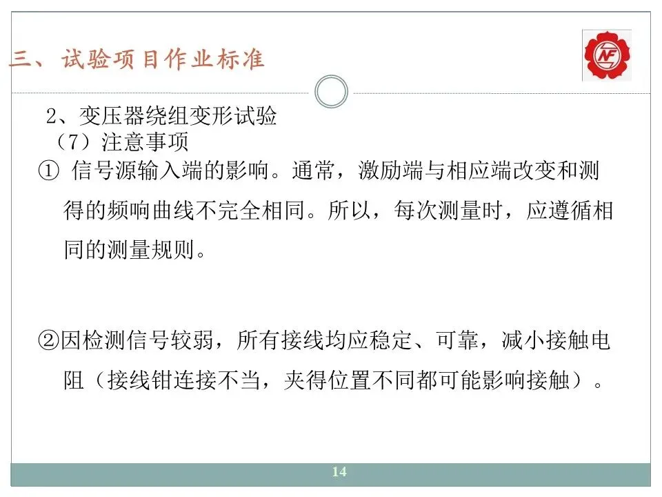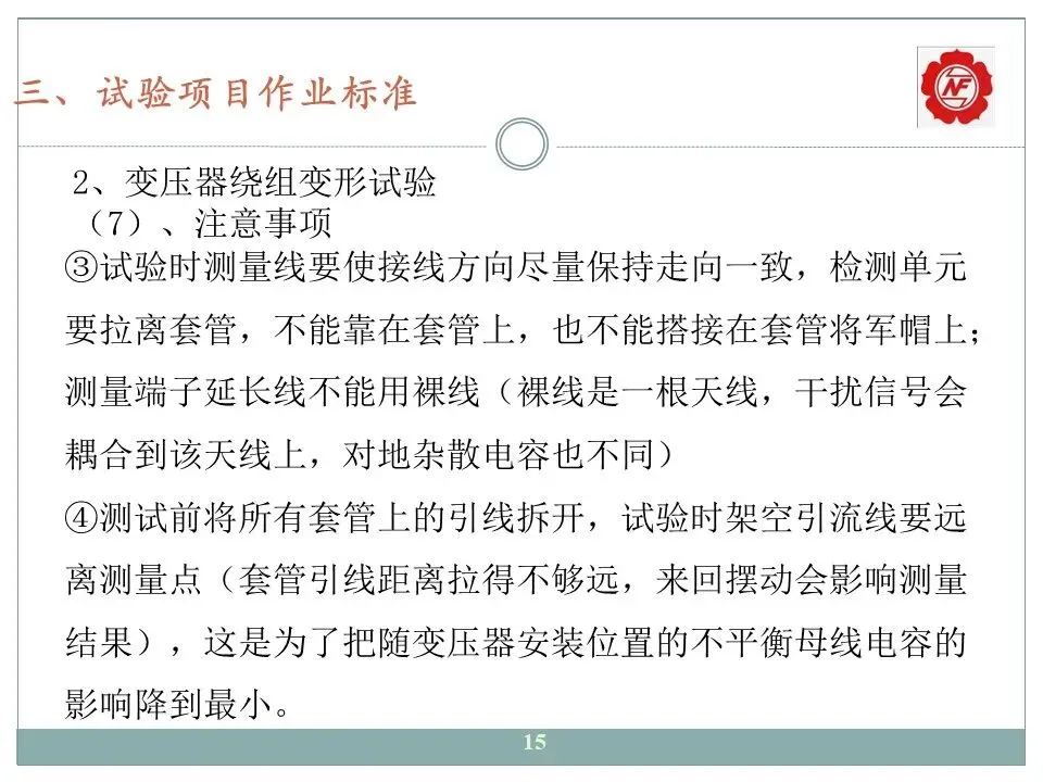 ③试验时测量线要使接线方向尽量保持走向一致,检测单元要拉离套管,不能靠在套管上,也不能搭接在套管将军帽上;测量端子延长线不能用裸线(裸线是一根天线,干扰信号会耦合到该天线上,对地杂散电容也不同)