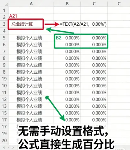 实操示例:A2为个人业绩,A21为总业绩,想计算A2业绩占比,输入=TEXT(A2/A21,"0.00%"),按回车直接显示两位小数的百分比,下拉公式批量计算整列占比