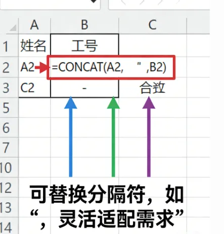 实操示例:A2为姓名,B2为工号,想在C2合并为“姓名-工号”,输入=CONCAT(A2,"-",B2),按回车生成合并结果,下拉公式批量合并整列