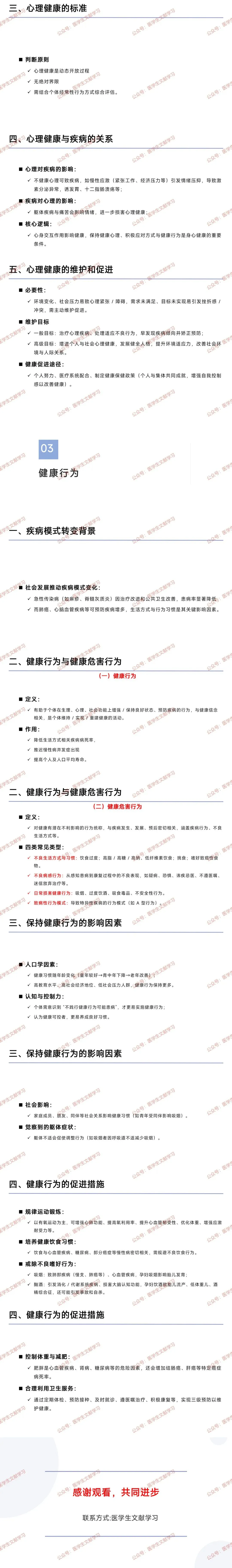 - WHO 三维健康:身体、心理、社会功能的完满状态,非仅无病弱,健康与疾病是连续的量变过程。