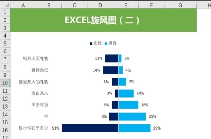 - 例子1:男女比例对比。将男性数据放在右侧,女性数据放在左侧,中间添加分隔线,清晰展示不同年龄段的性别分布差异。