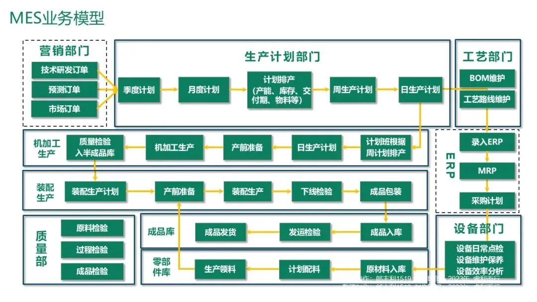 MES在整体企业信息架构中处于核心位置,连接了ERP(企业资源计划)、技术研发、采购、质量、设备等部门。其业务模型涵盖了从计划排产、生产准备、生产执行、质量检验到成品入库和发货的全过程。主要输入包括: