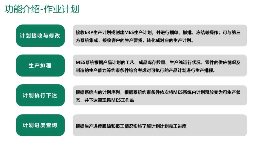 计划接收与修改:从ERP接收生产计划,或在MES内创建计划,支持插单、撤排、冻结等操作。