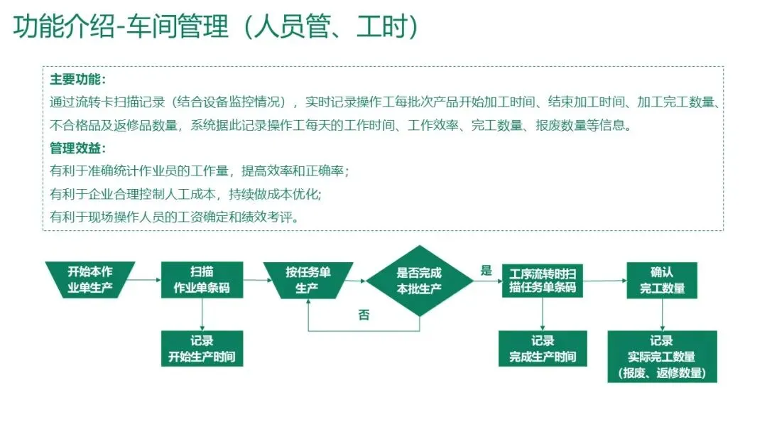 人员管理:通过扫描流转卡或作业单条码,记录操作工每个批次的开始/结束时间、完工数量、不合格品及返修数量。
