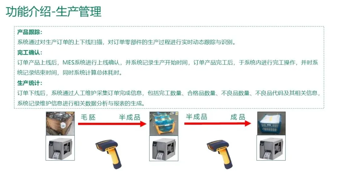 产品跟踪:利用条码/RFID技术,对生产订单从上线到下线全程跟踪,实时识别产品状态(毛坯、半成品、成品)。