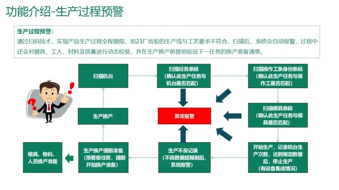 生产过程预警:在扫描过程中自动校验机台、操作工、模具是否匹配,发现不符或不良品超限时报警。同时,在换产前自动提示下一任务的准备清单。