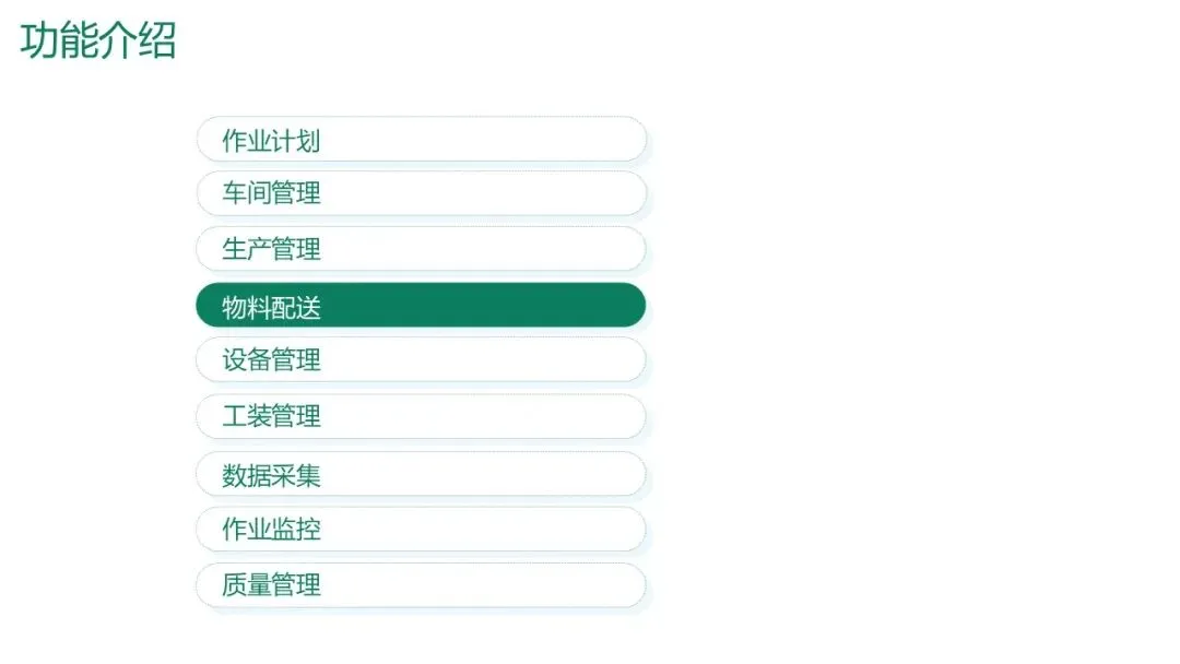 物料配送看板:根据生产计划和过点采集数据,实时计算线边库存,动态显示各工序的物料配送需求,触发拉动式配送。