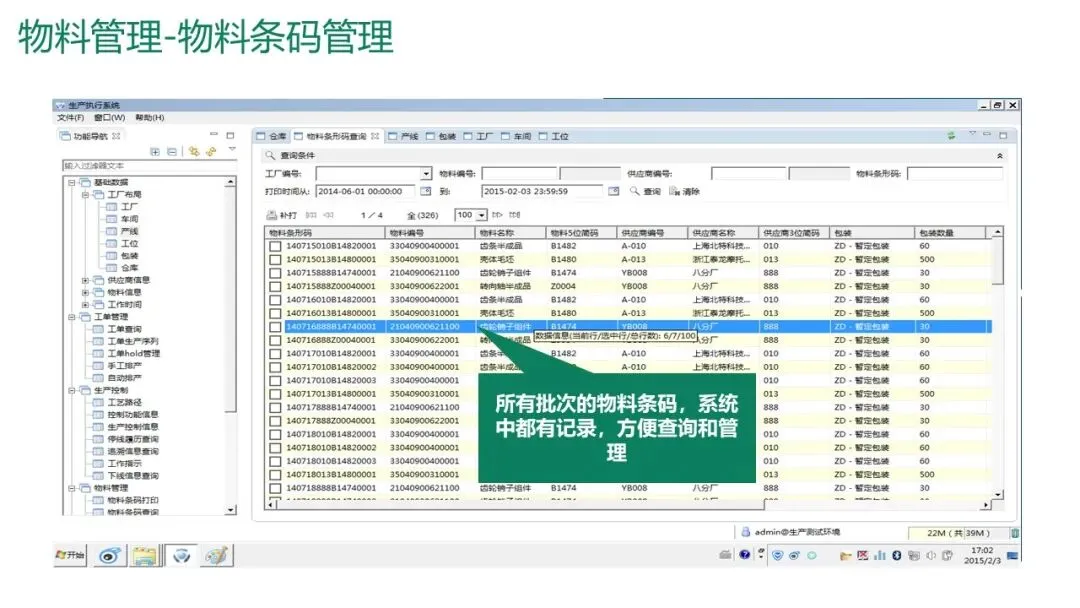 物料条码管理:为物料和包装箱生成并打印条码,记录供应商、批次、生产日期等信息,支持批次管理。