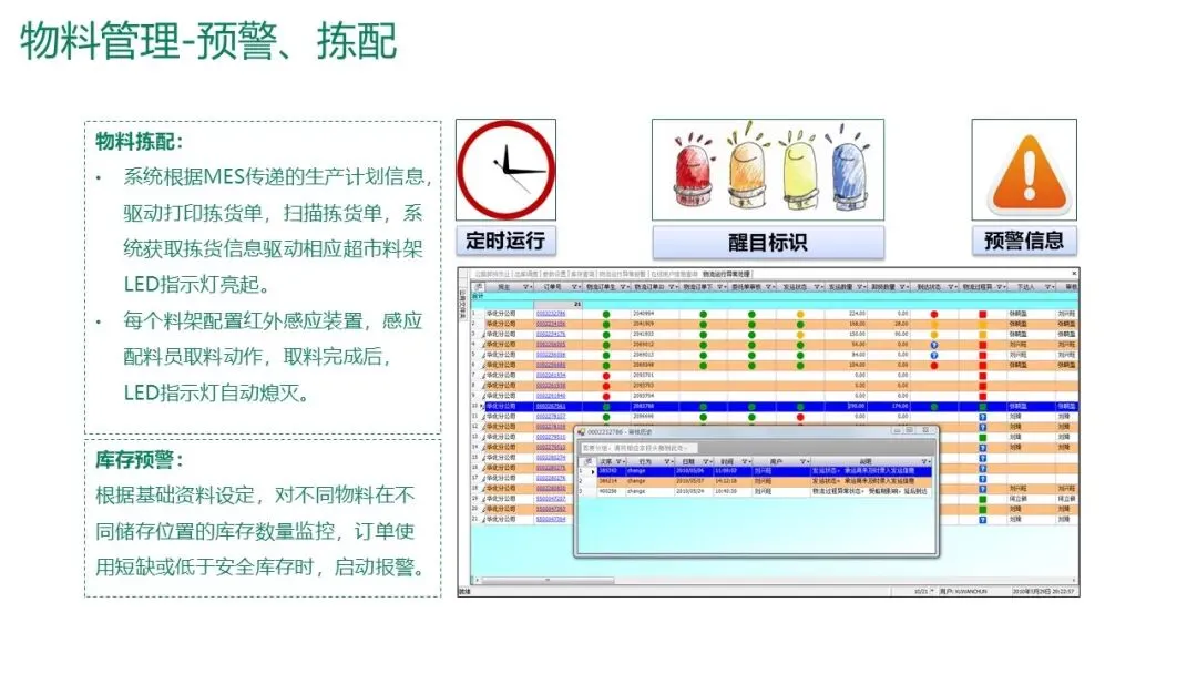 物料拣配:系统驱动打印拣货单,扫描后通过料架LED指示灯引导拣选,红外感应确认取料,实现精准配料。