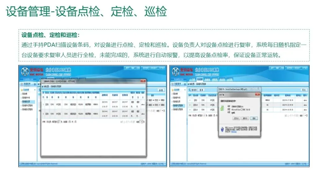 设备点检/巡检:通过PDA扫描设备条码进行点检、定检和巡检,系统自动提醒并记录,异常时报警。