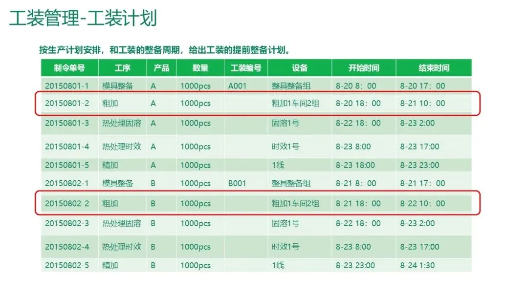 工装计划:根据生产计划和工装整备周期,提前生成工装准备计划。