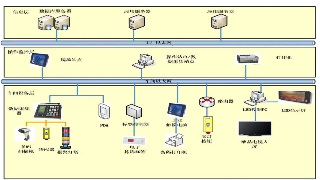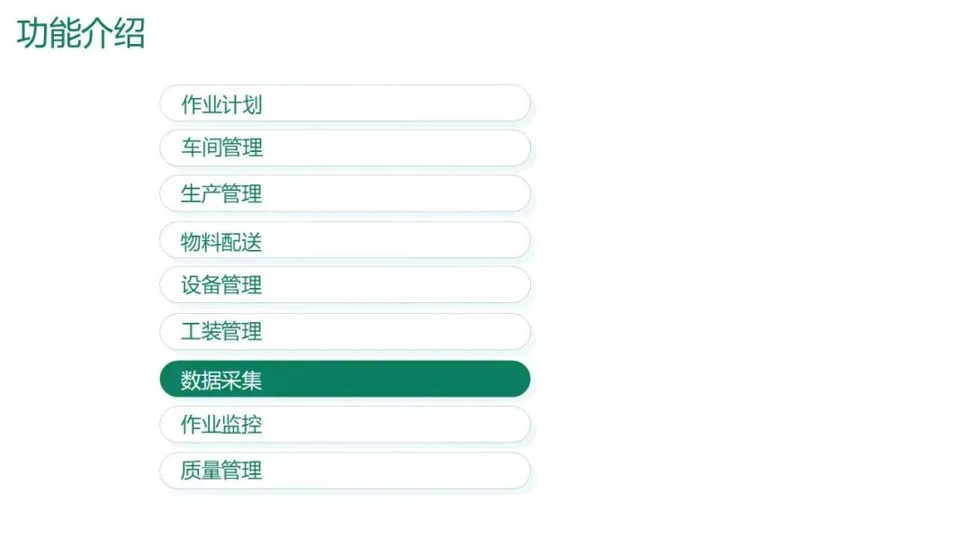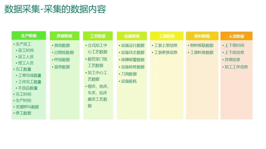 采集内容:包括生产数据(派工、完工、不良)、质量数据(首检、过程检、终检)、工艺数据(设备参数)、设备数据(运行状态、故障)、物料数据、人员数据等。