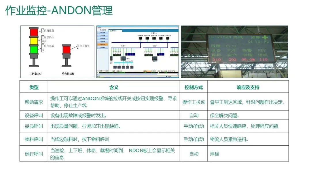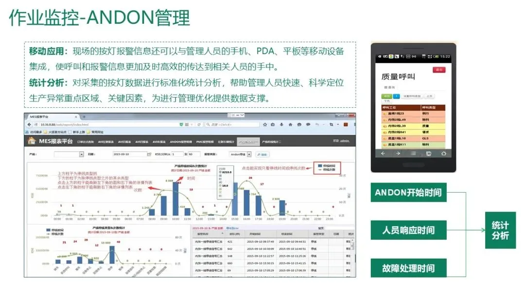 ANDON管理(安灯系统):现场通过按灯呼叫物料、质量、设备等支援。系统记录开始时间、响应时间和处理时间,并通过移动端推送给相关人员。统计分析异常区域和因素,辅助管理优化。