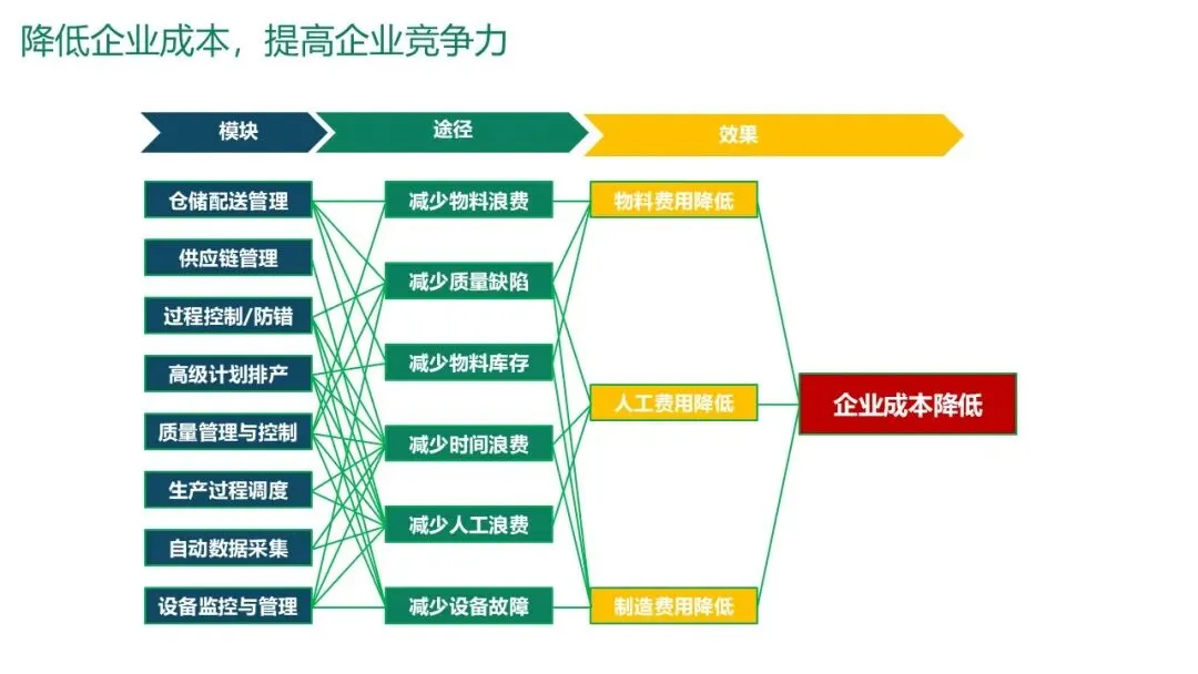 降低企业成本:通过减少物料浪费、质量缺陷、库存积压、时间浪费、设备故障和人工浪费,全面降低制造费用。