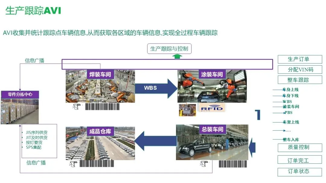 功能:通过RFID或条码,在关键跟踪点(如WBS、PBS、涂装出入口、总装出入口)自动读取车身信息,获取车辆实时位置和状态,实现全过程跟踪。