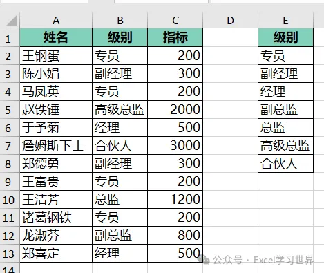 MATCH(B1:B13,E1:E8,):计算出 B1:B13 中的各个级别在 E1:E8 中所处的位置;第三个参数省略,会返回区域 E1:E8 中最接近的下个最小值的位置;