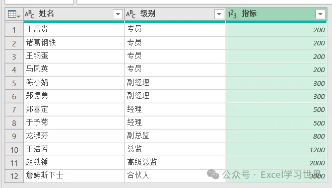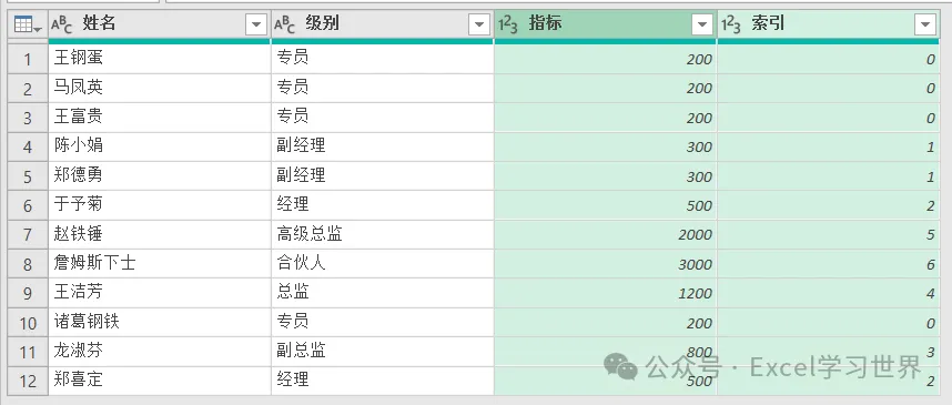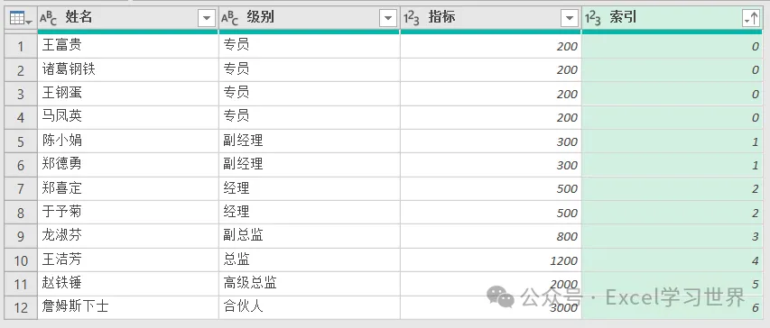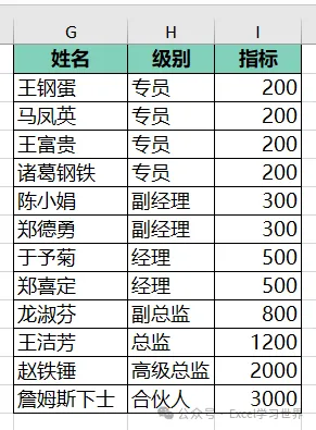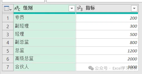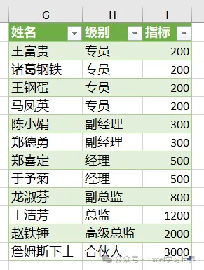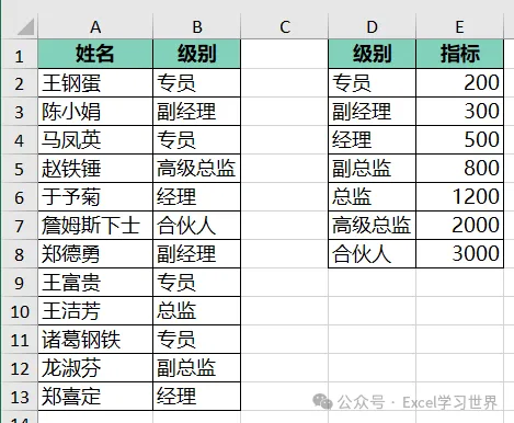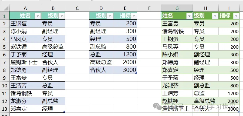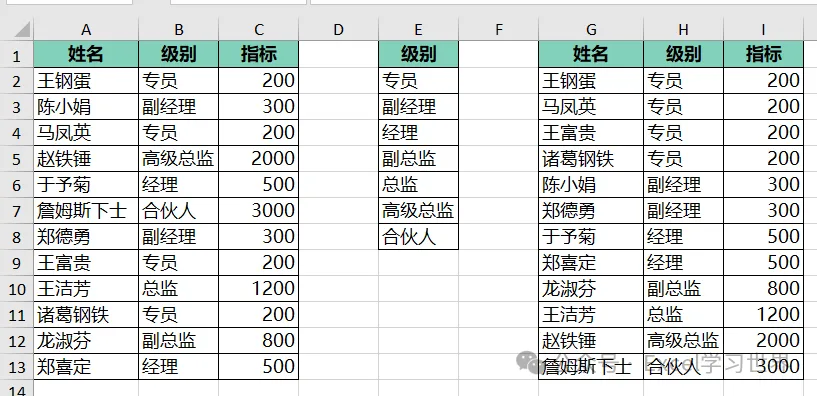 将下图 1 中左侧的数据表中的级别按右侧数据表的 D 列排序,最后将对应的指标匹配过来。