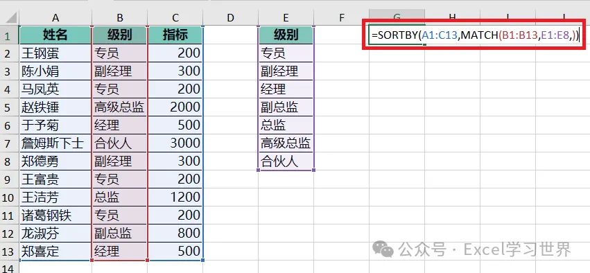 SORTBY(A1:C13,...):将区域 A1:C13 按照 match 函数返回的位置数以升序排序
