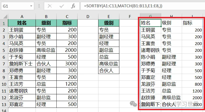 将下图 1 中左侧的数据表按 E 列的级别排序,效果如下图 2 所示。