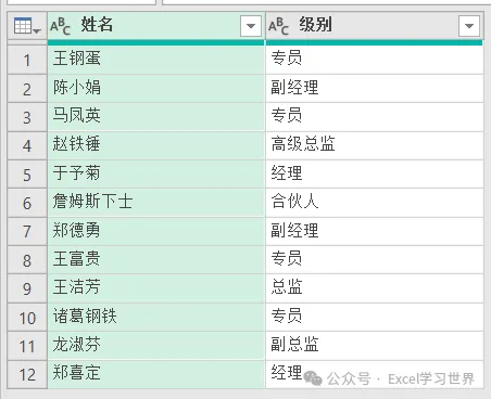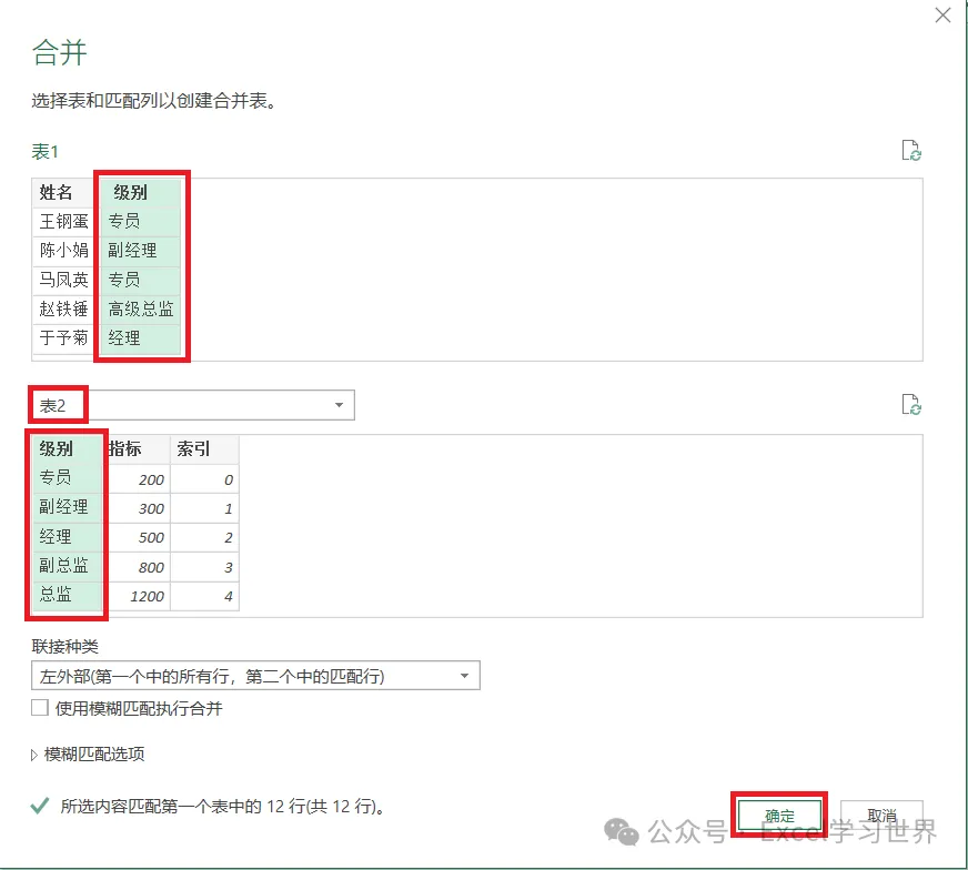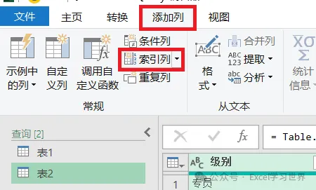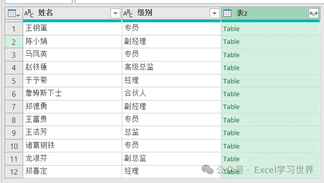 在下拉菜单中选择“表2”--> 选中“级别”列