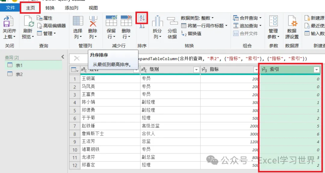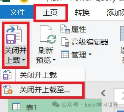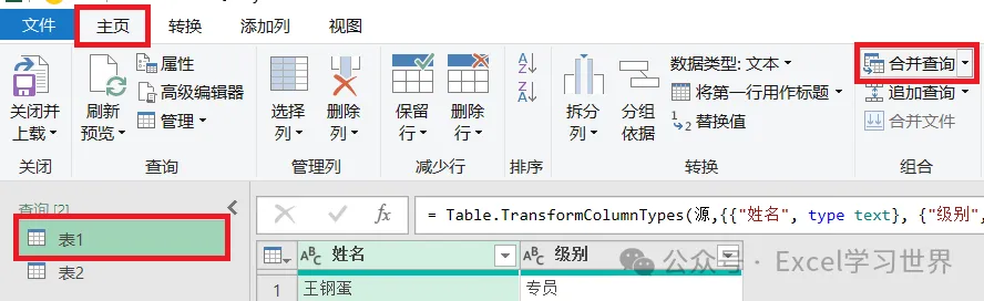 7. 在左侧的“查询”区域中选中“表1”--> 选择工具栏的“主页”-->“合并查询”