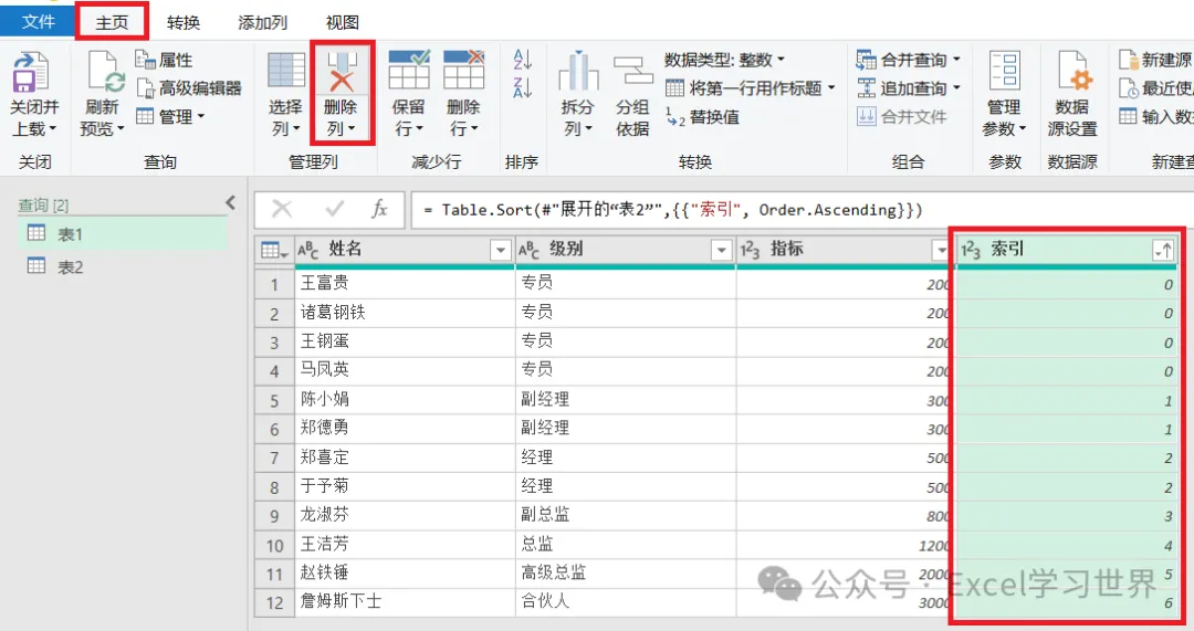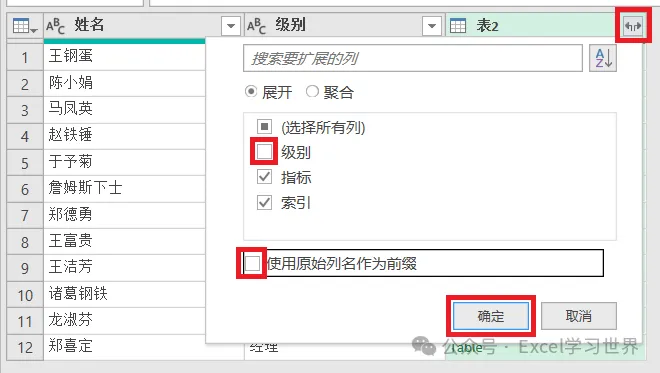 9. 点开“表2”旁边的扩展钮 --> 在弹出的菜单中取消勾选“级别”和“使用原始列名作为前缀”--> 点击“确定”