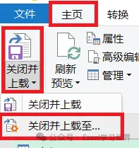3. 选择工具栏的“主页”-->“关闭并上载”-->“关闭并上载至”