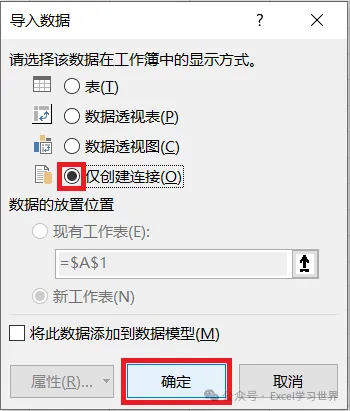 4. 在弹出的对话框中选择“仅创建连接”--> 点击“确定”