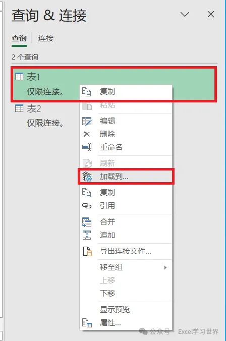 14. 在右侧的设置区域中选中“表1”--> 右键单击 --> 在弹出的菜单中选择“加载到”