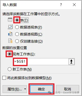 15. 在弹出的对话框中选择“表”--> 选择“现有工作表”及所需上传至的位置 --> 点击“确定”