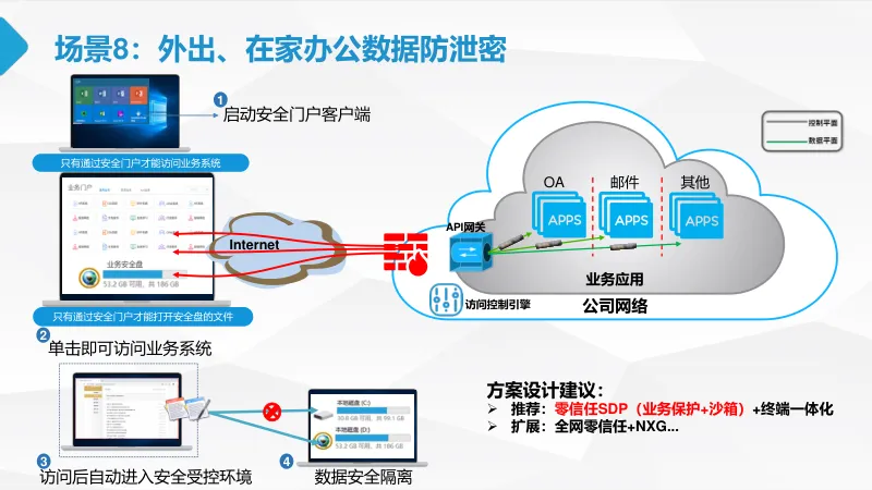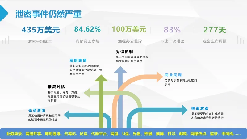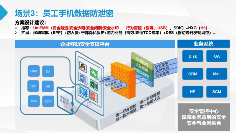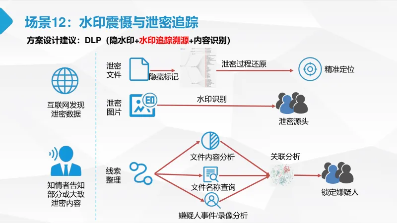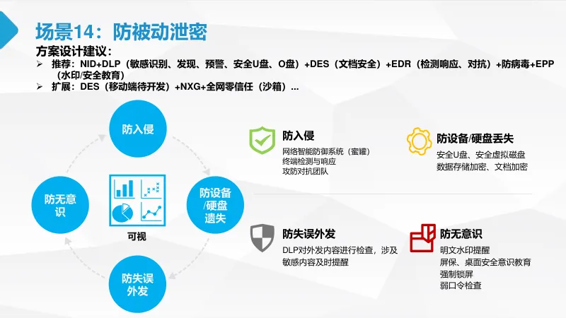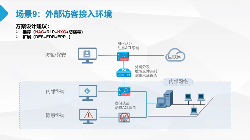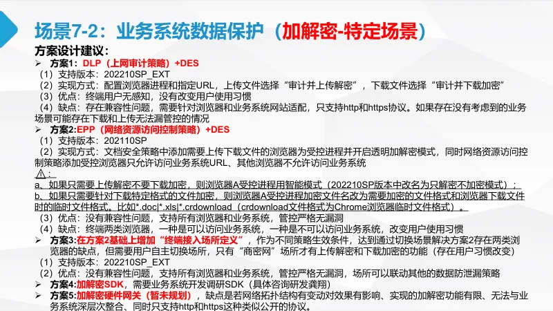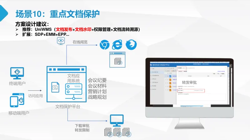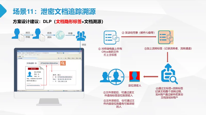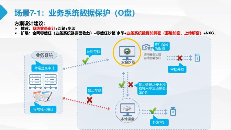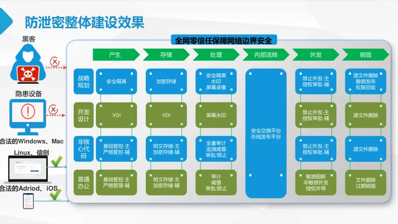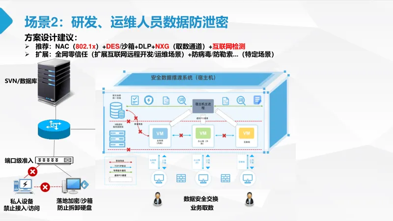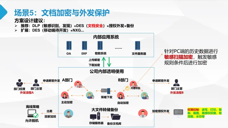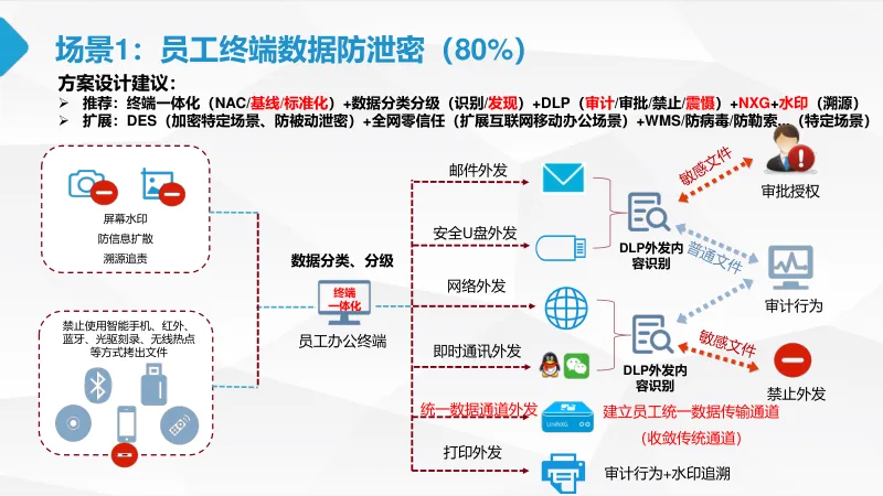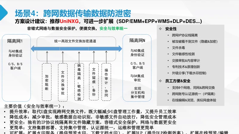 - 二、落地场景化防护,覆盖全业务环节针对员工终端、研发运维、手机办公、跨网传输、外出办公等 14 类典型场景设计专属方案,比如终端采用 “一体化管控 + DLP 审计 + 水印溯源”,跨网传输用 UniNXG 实现协议隔离与加密交换,核心文档依托水印、隐形标签做全流程追溯,从源头阻断泄密渠道。