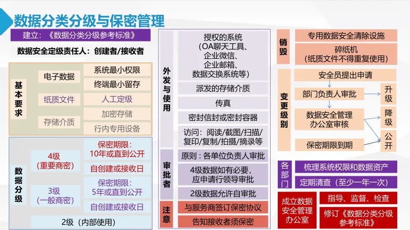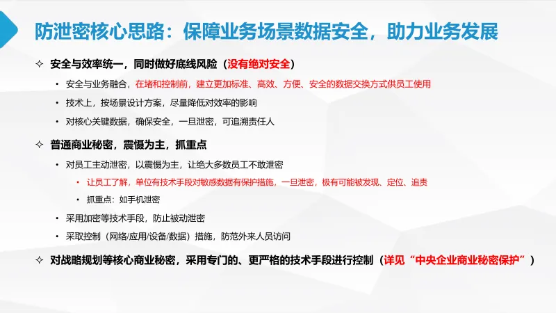 - 一、先定核心策略,明确防护边界以 “保障业务、安全与效率统一” 为核心,普通商密以技术震慑为主,核心商业秘密采取严格管控;先梳理企业数据分布、权限分配、办公网络环境,按 “工作必需、最小授权” 原则划分数据密级,确定防护场景与范围。